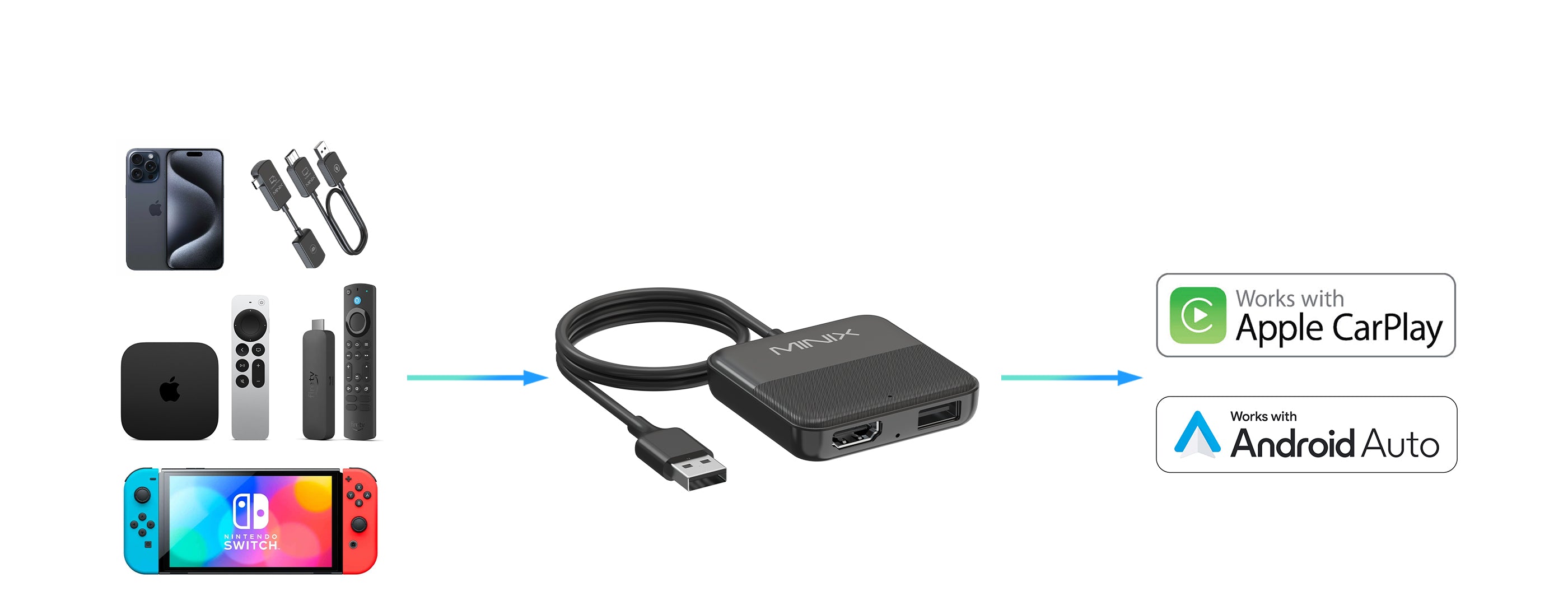 MINIX 3-in-1 Wired Carplay/Android Auto to Wireless Connection/HDMI-In Media Hub Adapter. USB-A to USB-C Adapter Included.