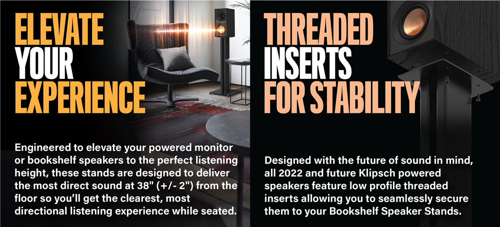 Designed with the future of sound in mind, all 2022 Klipsch powered or passive monitors will feature low profile threaded inserts allowing you to seamlessly secure them to your 24” Universal Speaker Stands. Upgrading your home theater setup has never been easier with the most secure, versatile speaker stands on the market. As you evolve your gaming, music, TV or movie setup, you’re guaranteed to find the best stereo image possible with Klipsch.