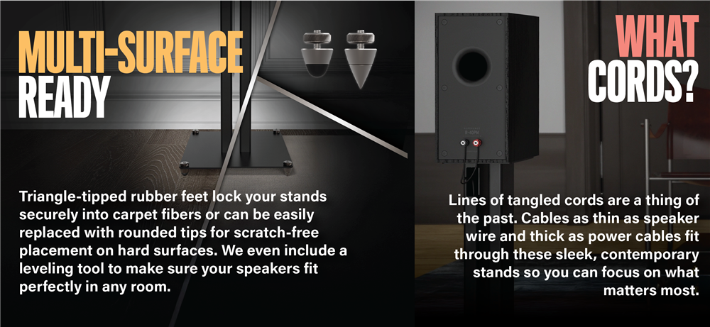 Great sound shouldn’t come with a risk. That’s why we designed multi-surface adjustable feet to keep your speaker stands steady on hardwood floor or carpeting. Triangle-tipped rubber feet lock your stand securely into carpet fibers or can be easily replaced with rounded tips for scratch-free placement on hard surfaces. You’re just a few twists away from securing your elevated speakers in any room of the house.