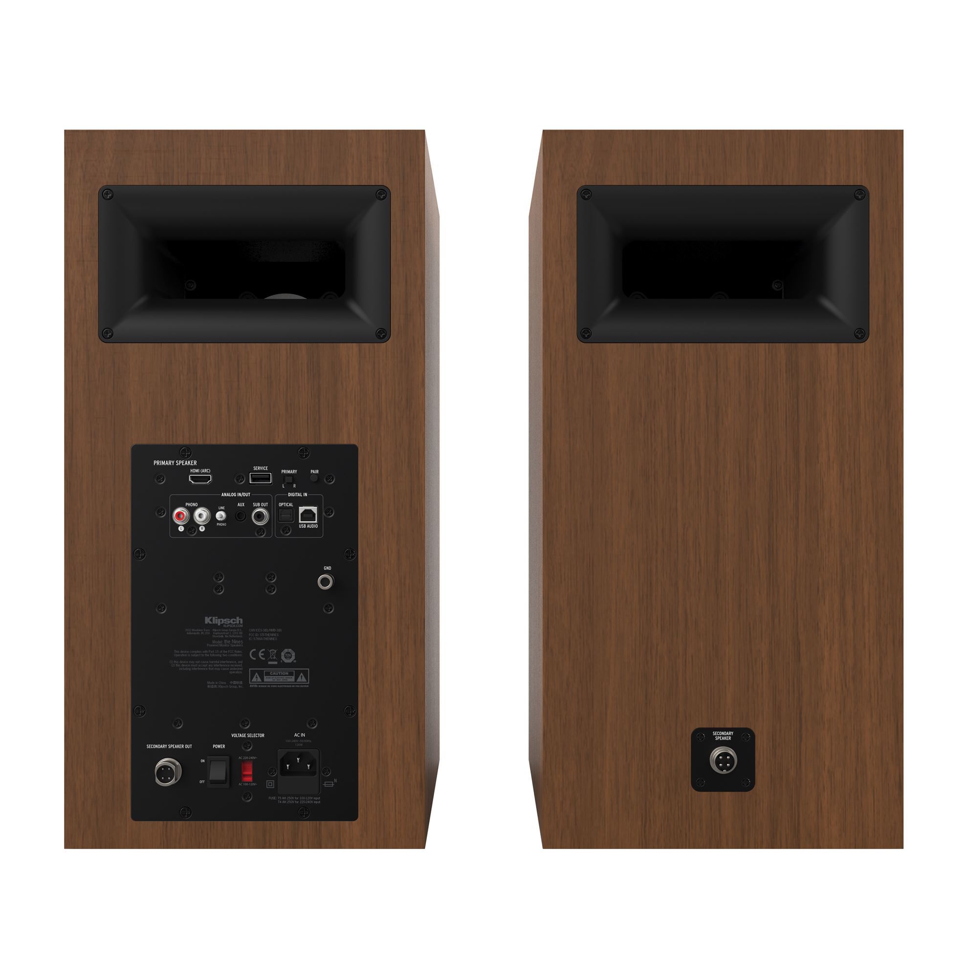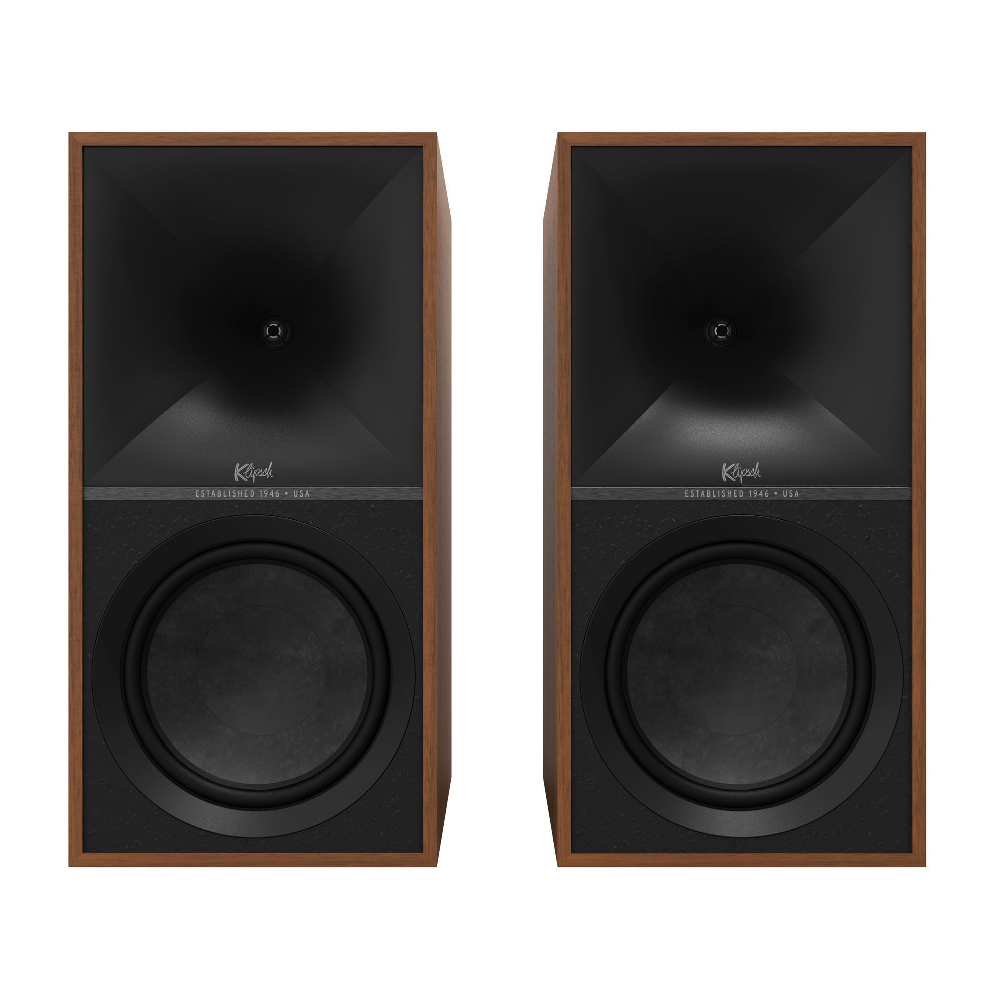 Klipsch powered bookshelf speakers deliver 240W system power (480W peak) with an 8" woofer and 1" titanium tweeter, covering 34Hz–25kHz and reaching 115dB output. Features include HDMI-ARC, Bluetooth 5.0, phono/line, USB, optical, and subwoofer output in a rear-ported MDF enclosure with walnut veneer.