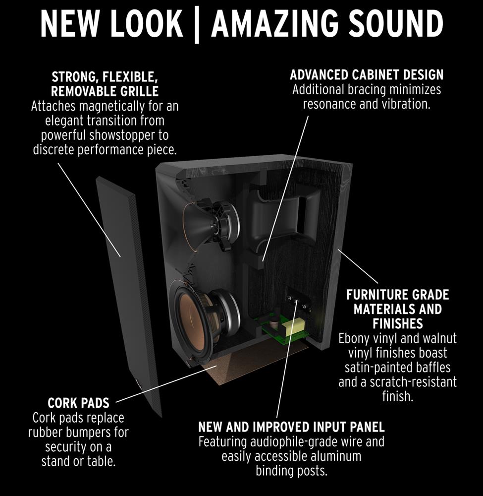 Finishes include ebony vinyl and walnut vinyl that boast satin-painted baffles with a scratch-resistant finish.