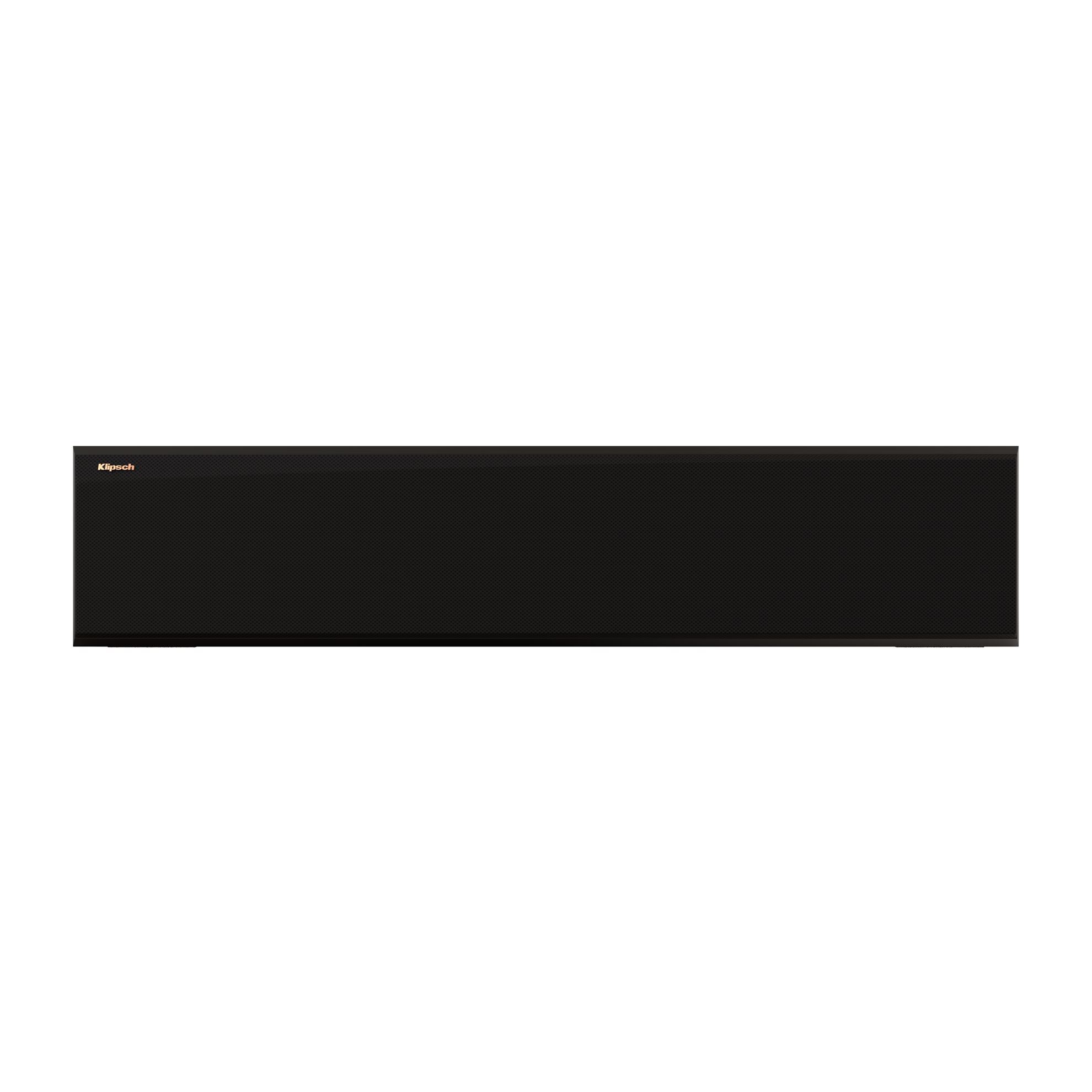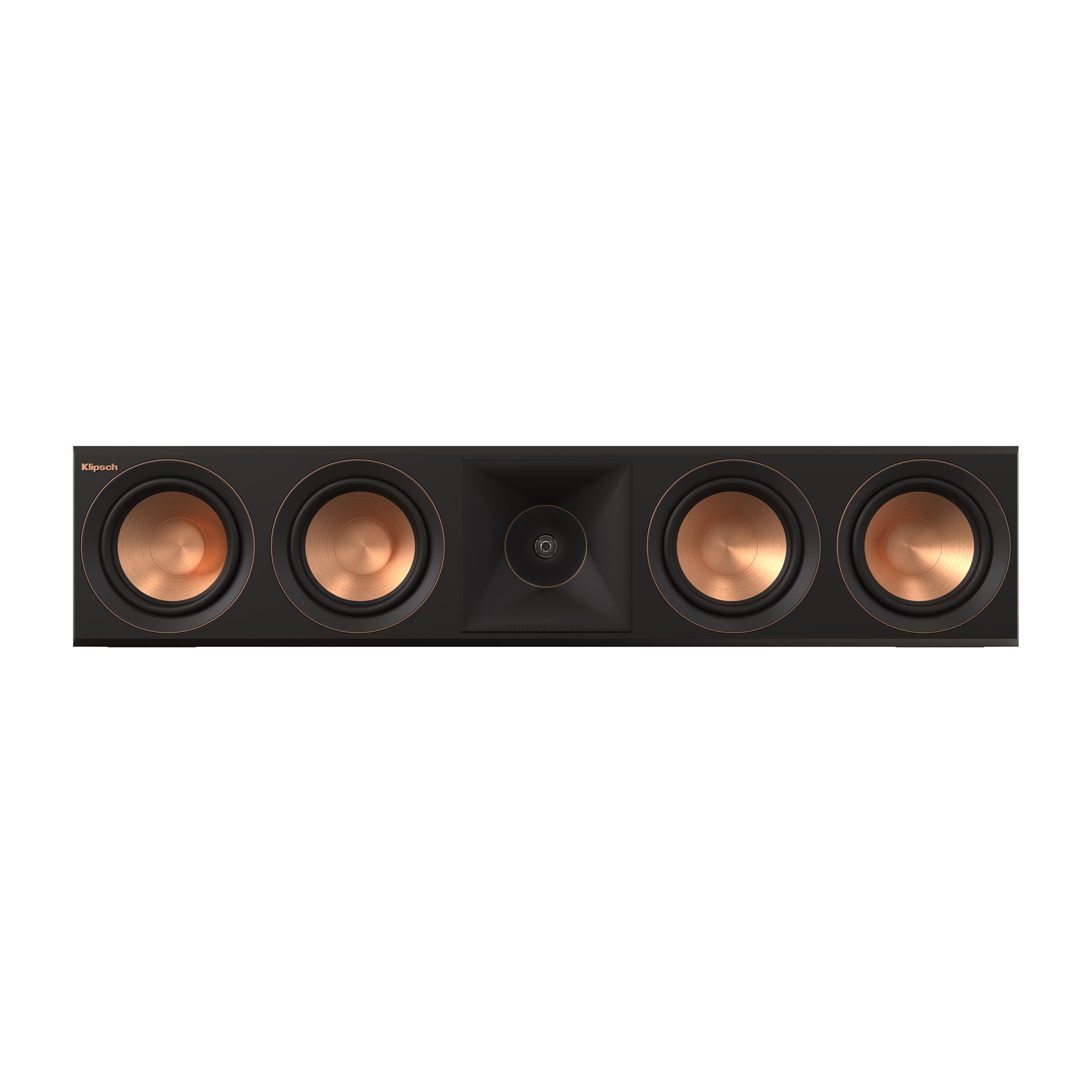 Klipsch Reference II centre speaker with quad 5.25" Cerametallic cone woofers and 1" titanium LTS vented tweeter in a Tractrix® horn. Delivers 50Hz–25kHz frequency response, 96dB sensitivity, 150W/600W power handling, and 8 ohm compatibility with 650Hz/1950Hz crossover. MDF cabinet with rear Tractrix® port, single binding posts. Measures 6.87" x 32.06" x 15.08", weighs 36.3 lbs, finished in ebony with angle screw accessory.