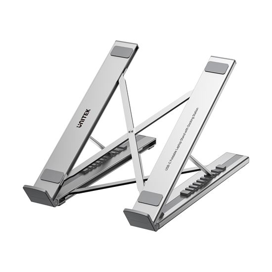 The UNITEK USB-C Foldable Laptop Stand with Docking Station combines style and functionality. It offers a single 4K@60Hz monitor output, 2 x USB-A 5Gbps ports, and 1x USB-C 5Gbps port for fast data transfer. With Power Delivery (PD) up to 100W and an SD/Micro SD card reader, this compact 7-in-1 dock keeps your devices charged and connected, making it an essential accessory for productivity on the go.