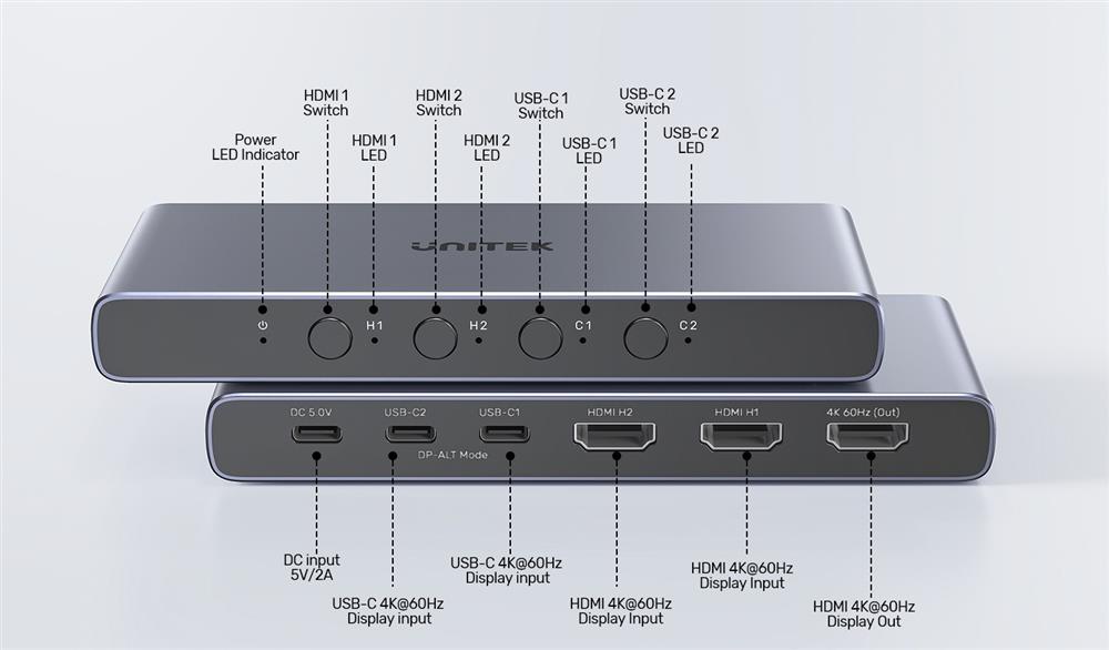 UNITEK 4K HDMI/ USB-C Switch 4-in-1 Out connects up to four devices, such as gaming consoles, tablets, mobile phones, and laptops, to your TV or monitor using just one input port. Seamlessly switch between PC screens, movies, games, and TV shows without the hassle of plugging and unplugging HDMI cables. For example, you can connect a desktop PC (HDMI), a laptop (HDMI), a smartphone (USB-C), and an iPad (USB-C).